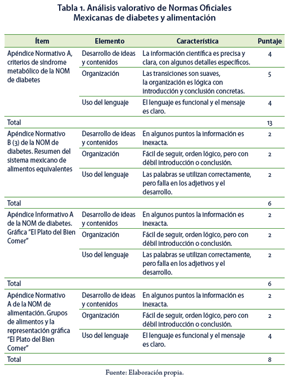 Para realizar este estudio analítico se emplearon como unidades de análisis los contenidos de la NOM015SSA22010, "Para la prevención, tratamiento y control de la diabetes mellitus" y la información complementaria que se encuentra en la NOM043SSA22012, "Servicios Básicos de Salud. Promoción y Educación para la Salud en Materia Alimentaria. Criterios para Brindar Orientación". Se realizó el análisis en dos niveles: descriptivo y valorativo. Este análisis se hizo desde la perspectiva reflexiva del enfoque curricular (independientemente del tipo de formalidad), desde donde se asume que los contenidos pueden ser legítimamente criticados y discutidos y la elaboración de nuevos contenidos es posible (De Agüero, 2000, p. 78).