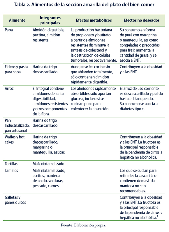 Si bien una comida puede ser sustituida por otra parecida, como es el caso de frijoles negros por lentejas, esta acción aplica menos a la sustitución de alimentos poco o nada procesados por alimentos preparados con productos que han sufrido transformaciones en el proceso de industrialización. Tal es el caso del almidón rápidamente digerible de la harina de trigo industrializada o el arroz descascarillado y pulido hasta blanquearlo si se comparan con las harinas y granos integrales. De manera paradójica estos alimentos altamente procesados aparecen como parte de las recomendaciones, tanto en los apéndices informativos de las NOM como en la representación gráfica, "El Plato del Bien Comer". Por ejemplo, en el "Manual para la preparación e higiene de alimentos y bebidas en los establecimientos de consumo escolar en los planteles de educación básica" (Gobierno Federal, 2010a, p. 48), se dice que los niños pueden sustituir la merienda escolar por productos de la repostería industrial. En el cuadernillo "Cómo preparar el refrigerio escolar y tener una alimentación sana" se recomienda el cereal de caja (Gobierno Federal, 2010b, p. 11) que puede tener hasta 30% de azúcar (Procuraduría Federal del Consumidor [PROFECO], 2011a). En ese mismo cuadernillo se promueve que los niños beban yogur líquido, jugos de frutas, néctares (Gobierno Federal, 2010b, p. 14), cuyo consumo debe evitarse (Rivera, Muñoz, Rosas, Aguilar, Popkin & Willet 2008a), lo que se muestra gráficamente en la representación gráfica "La Jarra del Buen Beber" (SEP, 2008, p. 84), la cual no se promueve pues es contraria a los intereses de la industria de bebidas. Esto fue evidente en la polémica que se generó tras la publicación de "La Jarra del Buen Beber" (Arroyo, Pardío, Meléndez & Loria, 2008; Rivera et al., 2008b), con la consigna de que la obesidad y la diabetes tienen un sustrato multifactorial, lo cual es contrario a la evidencia que muestra asociación entre el consumo de bebidas y las enfermedades crónicas no transmisibles (Jacoby, 2009) y entre éstas y el consumo de productos industrializados (Clark et al., 2012), sobre todo los productos ricos en fructosa (Goran et al., 2013).