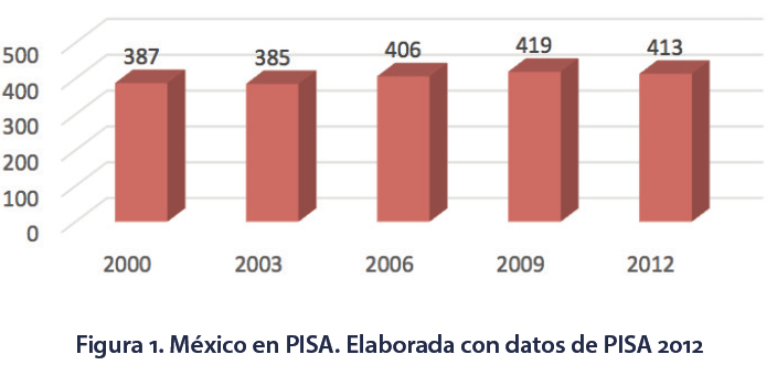 En esta investigación se trabajó con profesores de matemáticas en secundaria debido a que en las distintas evaluaciones nacionales e internacionales los estudiantes de este nivel han mostrado bajos resultados en el aprendizaje de las matemáticas. Por ejemplo, en la última evaluación realizada por la Organización para la Cooperación y el Desarrollo Económico (OCDE), en 2012, los puntajes de los alumnos mexicanos (413) están por debajo del promedio de los estudiantes de los países de esta organización (494), muy cercano al promedio de América Latina (399) y por debajo de países como Emiratos Árabes Unidos, Kazajistán, Tailandia, Chile y Malasia (OCDE, 2013). En los últimos 12 años ha habido una mejoría pero ha sido muy pequeña (Figura 1).