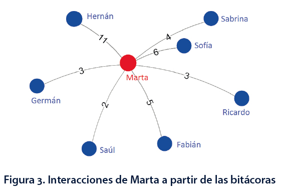La Figura 2 representa la participación general. Para ilustrar mejor las interacciones que ocurrían a partir de las bitácoras se presentan un gráfico con la retroalimentación dada y recibida por Marta (Figura 3) quien tuvo 34 retroalimentaciones a sus bitácoras. Hernán fue quien más la retroalimentó, seguido de Sofía y Fabián. Es importante mencionar que muchos más leían las bitácoras, pero no necesariamente daban una retroalimentación y por tanto no aparecen en el gráfico.