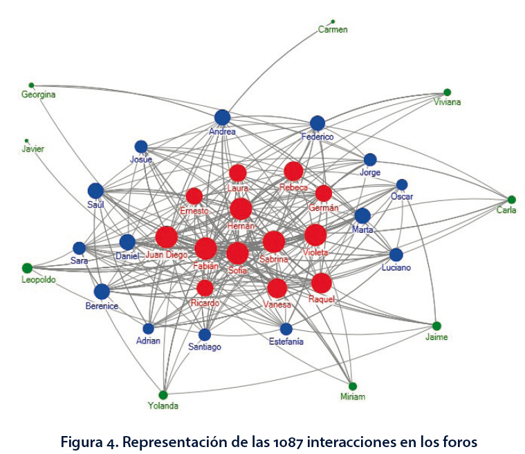 La Figura 4 muestra la participación global y quién le respondía a quién. En la Figura 5 puede apreciarse cómo los de más alto nivel de participación se respondían mucho entre ellos. Ahí puede verse claramente cómo se daba la interacción. Había quienes participaban sin responder en particular a alguno de sus compañeros. Ellos no aparecen en el gráfico, que registra únicamente las interacciones.