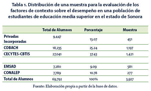 La población estudiada corresponde a 70 mil estudiantes de nivel medio superior en el norte de México (estado de Sonora, en el noroeste de México). Los datos se obtuvieron al aplicar el instrumento de conocimientos y de contexto a segundo, cuarto y sexto semestre mediante una muestra representativa de 3,927 estudiantes (SierraBravo, 1985) para las cuatro modalidades de EMS: privadas (incorporadas al Colegio de Bachilleres [COBACH] y Universidad de Sonora [UNISON]). Segundo, COBACH del Estado de Sonora, tercero, instituciones de EMS de la DGETI (Dirección General de Educación Tecnológica e Industrial) que incluyen CECYTES y CET del mar, Centro de Bachillerato Tecnológico Industrial y de Servicios (CBTIS), Educación Media Superior a Distancia (EMSAD) y cuarto el Colegio Nacional de Educación Profesional Técnica (CONALEP), con un diseño de muestra de 3% de error y 95% de confiabilidad, con una p = .5 y una q = .5 (Tabla 1).