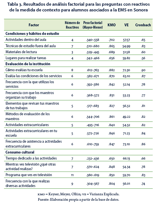 Para poder cumplir con el objetivo, se necesita en principio validar por constructo una medida diseñada para las variables de contexto. Con el objetivo de validar por constructo la medida de contexto y obtener la confiabilidad de los factores, en la Tabla 3 se presentan los resultados del análisis factorial exploratorio (AFE), dejando ver que los valores alfa de Cronbach van de .65 a .90, con cargas factoriales mayores a .30, con valores hasta .75 y con un índice de adecuación KMO (prueba KaiserMeyerOlkin) aceptable para llevar a cabo el análisis de componentes principales, donde la varianza después de una rotación varimax es siempre mayor a 50%. Se integran los factores en tres rubros: condiciones y hábitos de estudio, evaluación de la institución y consumo cultural.