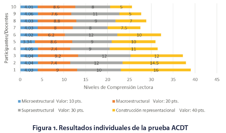 Los puntajes obtenidos por categoría (microestructural, macroestructural, supraestructural y construcción representacional) y nivel de comprensión (superficial, intermedio y profundo) exponen variables de ACDT. En el caso de la categoría microestructural (con un valor máximo de 10 puntos), los docentes muestran una comprensión de 4 puntos de 10, esto los coloca en una comprensión intermedia; es decir, la decodificación llega al texto base, lejos de expresar una comprensión de lectura profunda (la cual va de 6.6 a 10 puntos), reflejo de un modelo situacional de combinación y relación de términos.