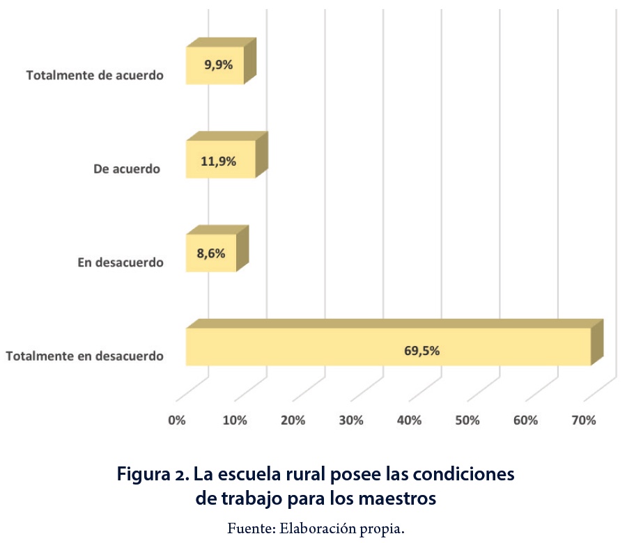 Si hablamos de escuela rural es imposible pensar en centros que tengan recursos e infraestructuras adecuadas situados fuera de las villas. En lo que respecta a las condiciones laborales de los maestros en este ámbito, adquieren relevancia el salario, los espacios físicos y la infraestructura, los recursos tanto materiales como tecnológicos, el estado anímico de los docentes, etcétera, pues aportan posibilidades al correcto desempeño profesional y garantizan un clima efectivo en la escuela (Granados, Antolínez & Rivera, 2014).