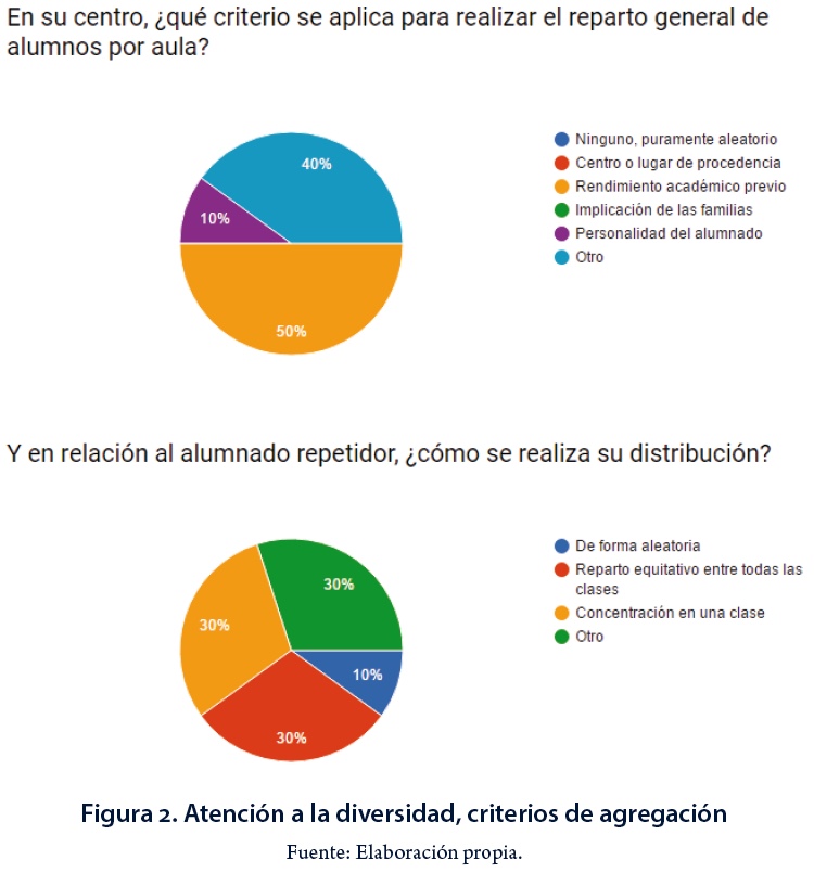 Las causas de esta situación guardan una clara relación, entre otros aspectos a considerar, con la forma de configurar las aulas: 50% de los entrevistados sostiene que el criterio para ocupar las clases de los diferentes cursos es el rendimiento académico, seguido de un extrañamente alto porcentaje de docentes que prefirieron no especificarlo o fueron demasiado laxos en su concreción para poder categorizar su respuesta (40%), y en último lugar, 10% basado en la personalidad del alumnado. La naturaleza de los datos obliga a reflexionar sobre esta pregunta, ya que parece claro que aquí se ha dado con un elemento sensible que exige probablemente un mayor desglose y circunloquio metodológico.