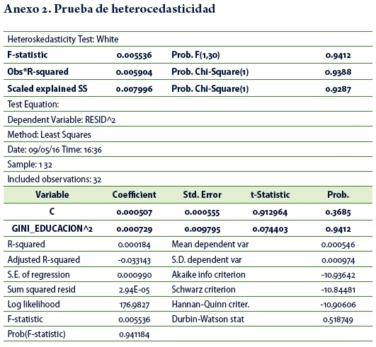 Para probar la hipótesis sobre si una mayor desigualdad educativa es determinante de una mayor desigualdad en la distribución del ingreso, se procedió a realizar una regresión lineal por mínimos cuadrados ordinarios entre estas dos variables. Los resultados obtenidos se muestran en la Tabla 3.