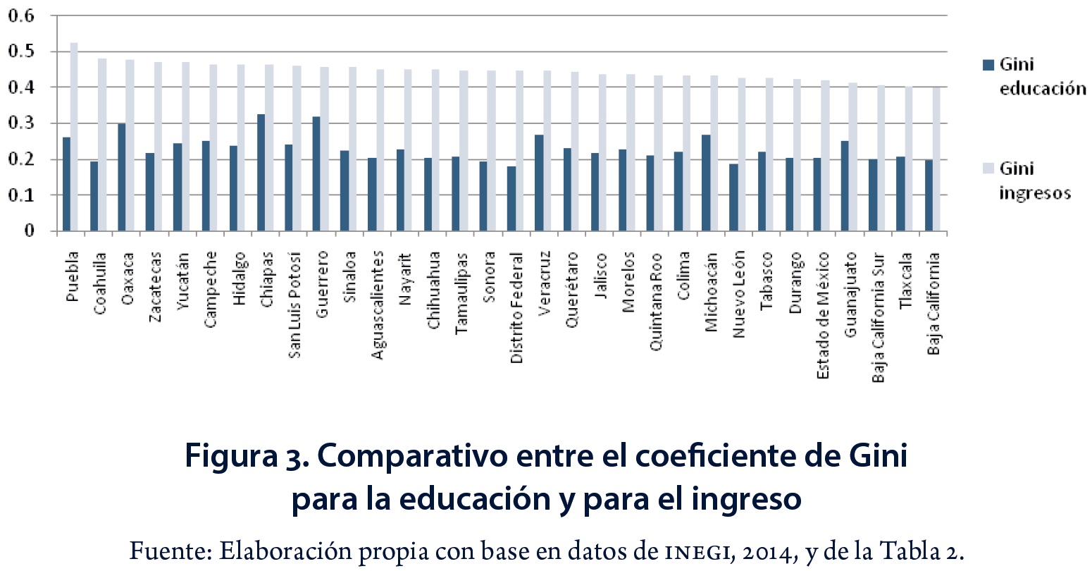 Figura 3. Comparativo entre el coeficiente de Gini para la educación y para el ingreso