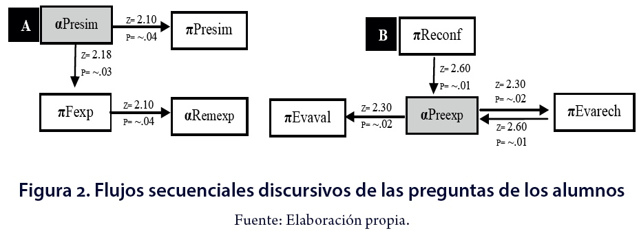 La información obtenida permitió observar los niveles probabilísticos Z y P, a partir de los cuales los flujos discursivos pudieron interpretarse al seleccionar los residuos ajustados y considerarlos excitatorios cuando promovían la aparición de una categoría (con un valor Z>1.96), o inhibitorios si la prevenían (Z<-1.96). Con la finalidad de cumplir el objetivo planteado en la presente investigación se dividieron en dos partes los resultados: en respuestas y preguntas realizadas por los alumnos. Posterior a cada explicación, se presentará un ejemplo típico de la secuencia así como una figura donde se muestre la manera en que se desarrollan los flujos secuenciales de discurso.