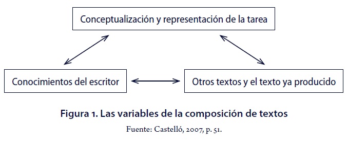 A partir de otros trabajos de investigación sobre los procesos de escritura Flower (1979), Bereiter y Scardamalia (1987) y Camps, Milian, Pérez, Ribas y Castelló (2001, citados en Castelló 2007) y sobre la escritura académica (Castelló, 2000), Castelló (2007) distingue tres variables implicadas en la composición de textos académicos: la representación de la tarea, el conocimiento previo del escritor y las exigencias del texto y de otros textos escritos anteriormente (Figura 1). Éstas actúan de forma simultánea durante la producción textual. Las relaciones que establece el sujeto entre ellas y la posibilidad de concientizarse de su influencia determinan el proceso de escritura y definen el texto que obtenemos como producto final.