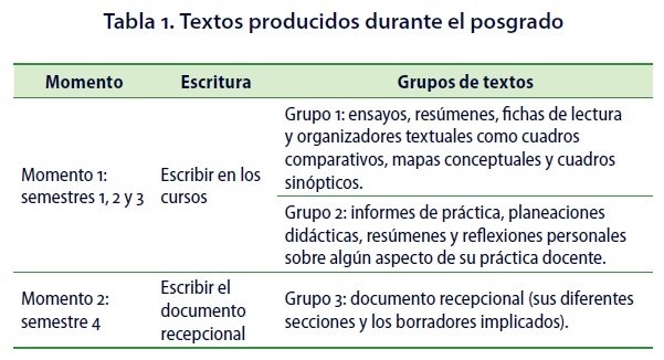 Según la clasificación (Tabla 1), los textos del primer grupo se utilizan en otros momentos de la escolaridad como la preparatoria y la licenciatura. Incluso son comunes en varias disciplinas, al menos en la forma de enunciarlos. En cambio, los textos del grupo 2 están más relacionados con la formación docente, en especial con temas de reflexión sobre la práctica; es decir, disciplinarmente son más específicos que los primeros. En el grupo 3 está el documento recepcional. Un género característico de los posgrados profesionalizantes en educación, que se utilizó como modalidad de titulación en las licenciaturas en educación primaria y preescolar en los Planes de estudio 1997 y 1999, respectivamente.