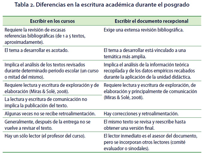 Tabla 2. Diferencias en la escritura académica durante el posgrado