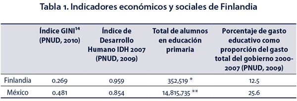 Los modelos educativos que han sido exitosos en ciertos contextos regionales o nacionales no necesariamente podrán serlo en otros. Sin embargo, la identificación de los fundamentos y prácticas seguidos por estos modelos, es el paso inicial para tratar de reconocer cuáles de ellos podrían ser contextualizados y replicados en el medio educativo mexicano. Lista de referencias Castells, M., & Himanen, P. (2002). El Estado del bienestar y la sociedad de la información. El modelo finlandés. Madrid: Alianza Editorial. Devlin, M. (2006). Suicide Facts 2004–2005 data. Wellington. Neva Zelanda: Ministry of Health Public Health. Fondo Monetario Internacional. ([FMI], 2010). World Economic and Financial Surveys. World Economic Outlook Database. Recuperado de http://www.imf.org/external/pubs/ft/weo/2009/01/weodata/index.aspx. Instituto Nacional de Estadística y Geografía. ([INEGI], 2011). Principales resultados del Censo de Población y Vivienda 2010. México: Autor. Recuperado de http://www.inegi.gob.mx/prod_serv/contenidos/espanol/bvinegi/productos/censos/poblacion/2010/princi_result/cpv2010_principales_resultadosII.pdf. Ministry of Social Affairs and Health of Finland. (2006). Alcohol Issues in Finland after Accession to the EU. Consumption, Harm and Policy Framework 1990-2005. Finlandia: Helsinki University Printing House. National Geographic. (2004). Atlas. Europa I. España: National Geographic Society, RBA Coleccionables. Oficina de las Naciones Unidad contra la Droga y el Delito. ([UNODC], 2008). World Drug Report 2008. Nueva York: Autor. Organización para la Cooperación y el Desarrollo Económico. ([OCDE], 2006). Finland: Economic Surveys. Francia: Autor. Organización para la Cooperación y el Desarrollo Económico. ([OCDE], 2007). OECD Briefing Note for Finland. París: Autor. Organización para la Cooperación y el Desarrollo Económico. ([OCDE], 2010a). PISA 2009 Data base. París: Autor. Organización para la Cooperación y el Desarrollo Económico. ([OCDE], 2010b). PISA 2009 Results: Executive Summary. París: Autor. Organización para la Cooperación y el Desarrollo Económico. ([OCDE], 2010c). Panorama de la educación. Indicadores de la OCDE 2010. España: Ministerio de Educación. Pirkola, S. M., Marttunen, Henriksson, M., Isomets, E., & Heikkinen, M. (1999). Alcohol-related problems among adolescent suicides in Finland. Alcohol and Alcoholism, 34(3), 320-329. Programa de Naciones Unidad para el Desarrollo. ([PNUD], 2010). Informe sobre desarrollo humano 2010. La verdadera riqueza de las naciones: Caminos al desarrollo humano. Nueva York: Autor. Riihelä, M., Sullström, R., & Tuomala, M. (2003). On Recent Trends in Economic Poverty in Finland. Tampere, Finlandia: Universidad de Tampere- Department of Economics. Simola, H., & Popkewitz, T. S. (1996). Professionalization and education. Helsinki, Finlandia: Department of Teacher Education. Statistics Finland. (2009). Population Structure 2009. Finlandia: Statistics Finland/ Ministerio de Finanzas. Recuperado de http://www.stat.fi. Statistics Finland. (2011). Population Structure 2010. Recuperado de http://www.stat.fi. The Finnish National Board of Education ([FNBE], 2007). The Finnish National Board of Education. Recuperado de http://www.oph.fi. The Finnish National Board of Education. ([FNBE], 2008). Finland-National report. Helsinki, Finlandia: Autor. Transparency International. (2011). Corruption Perceptions Index 2010. Berlin: Autor. Uusitalo, T. (2007). Suicides in Finland among children and young people. Rovaniemi, Finlandia: Ombudsman for Children in Finland/ Ministry of Social Affairs and Health. Recuperado de http://www.lapsiasia.fi/Resource.phx/lapsiasia/english/documents/publications/suicidesinfinland.htx.i1318.pdf. Välijärvi, J. (s. f.). Teacher’s professionalism and research-based teacher education. Finlandia: Universidad de Jyväskylä. World Bank (2008). Measuring Inequality. Recuperado de: http://web.worldbank.org/WBSITE/EXTERNAL/TOPICS/EXTPOVERTY/EXTPA/0,,contentMDK:20238991~menuPK:492138~pagePK:148956~piPK:216618~theSitePK:430367,00.html. World Economic Forum. (2010). The Global Competitiveness Report 2010-2011. Ginebra: Autor. [1]. En los estudios PISA se intenta evaluar la formación de los alumnos cuando llegan al final de la etapa de enseñanza obligatoria, hacia los 15 años. Se trata de una población que se encuentra a punto de iniciar la educación post-secundaria o que está por integrarse a la vida laboral. [2]. Indicador económico que intenta comparar el nivel de vida de los países de acuerdo con su producto interno bruto per cápita adecuado al costo de vida de cada país. [3]. Las escuelas multigrado son lugares donde, por el número reducido de alumnos que asisten a clase, el trabajo del docente es multinivel, es decir, en el mismo tiempo y espacio se trabaja con niños y niñas de diversos grados académicos. [4]. A menos que se diga otra cosa, los datos demográficos de Finlandia son de 2010 (Statistics Finland, 2011). [5]. A pesar de que el sueco es idioma oficial en Finlandia y de que todos los alumnos de las escuelas básicas lo estudian, sólo el 6% de la población se comunica de forma primordial con ese idioma. La población suecoparlante se ubica principalmente en las regiones de la costa sur-oeste y oeste de Finlandia. En otras palabras: a lo largo del Golfo de Botnia, el cual separa a ambas naciones. [6]. Índice desarrollado para las Naciones Unidas por un equipo de economistas liderados por Mahbub ul Haq (pakistaní). El IDH se compone de los siguientes indicadores: esperanza de vida, alfabetización/matriculación escolar y PIB per cápita (medido en paridad de poder adquisitivo en dólares norteamericanos). [7]. En relación a las naciones de la OCDE, Finlandia tiene la tasa más alta de suicidios en su población: 30.9 casos por cada 100,000 habitantes en 2003 (Devlin, 2006, p. 15). Con respecto a la población juvenil finlandesa (entre 15-24 años), la tasa de suicid