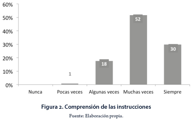 Fainholc (2004) menciona que existe una necesidad de alfabetización en las TIC para el desarrollo de competencias de interacción y nuevas prácticas de lectura. Ante tal afirmación de una docente que se ha dedicado a la investigación en tecnología educativa, se pensó en indagar si los estudiantes comprenden las instrucciones; solamente 30% declaró que siempre lo hace, y 52% lo hace "muchas veces" (Figura 2).