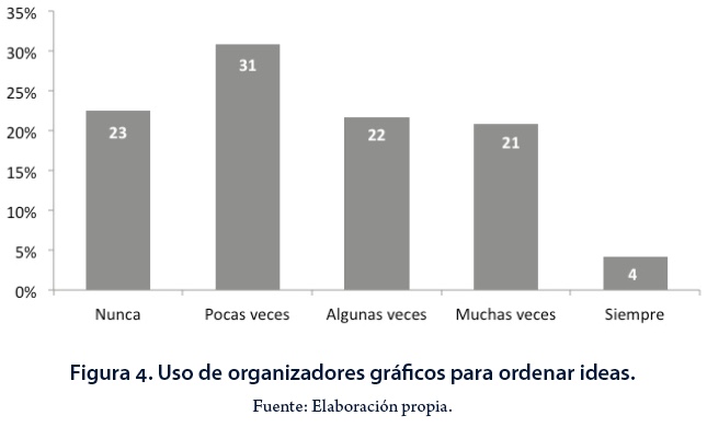 Como se mencionó anteriormente, la comprensión es fundamental para el aprendizaje significativo, por lo que se indagó si los estudiantes utilizan organizadores gráficos para ordenar sus ideas. La web ofrece diferentes herramientas gratuitas para crear mapas conceptuales como CmapTools o Mindomo, y para crear mapas mentales como Wisemapping o Mindmeinster. A pesar de todas las herramientas disponibles, solamente 4% declaró usarlas siempre, y 23% dijo no usarlas nunca (Figura 4). Los mapas mentales y los mapas conceptuales constituyen una estrategia muy útil, ya que permiten esquematizar y organizar información que hará que los estudiantes la procesen con mayor facilidad. Al estudiar cualquier tema, es "fundamental la interacción significativa del alumno con la tarea, en lugar de una captación meramente superficial y repetitiva" (Ontoria, Ballesteros, Cuevas, Giraldo, Martín, Molina, Rodríguez & Vélez, 2000, p. 27). Una vez que el estudiante comprende un tema, estará en posibilidades de escribir sobre el mismo con coherencia y cohesión.