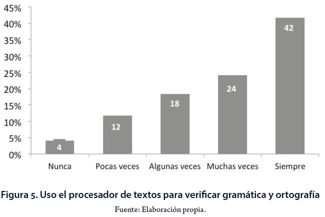 La tecnología ofrece muchas herramientas de apoyo para actividades relacionadas con la comunicación escrita, por lo que se exploró el nivel de uso que dan los estudiantes al procesador de textos para verificar gramática y ortografía; 42% mencionó que siempre lo usa, pero hay estudiantes que lo usan poco o nunca (Figura 5). La gran cantidad de estudiantes que recurre a este tipo de funciones podría explicarse por lo extendido del uso de procesadores de texto comerciales que permiten tales ayudas con ortografía y gramática. Sin embargo, los datos sugieren que algunos alumnos no usan o no saben usar las funcionalidades tipográficas, idiomáticas u organizativas de esta aplicación informática.