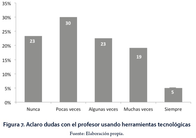 La comunicación con el profesor debe ser constante para aclarar dudas y compartir comentarios sobre los contenidos y materiales; sin embargo, los resultados del estudio muestran que solamente 5% siempre aclara sus dudas con el profesor utilizando los medios electrónicos a su alcance, y más de 50% está entre "nunca" y "pocas veces", lo que significa que la comunicación con el profesor es un problema para los estudiantes usuarios de LMS (Figura 7).