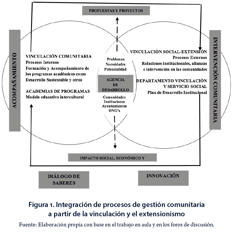 Esta experiencia condujo a los profesores de desarrollo sustentable a replantear como una estrategia la gestión de proyectos comunitarios, pero de manera externa al modelo educativo. La figura jurídica propuesta fue como Agencia de Desarrollo, para atender actividades de capacitación e incubación de proyectos productivos y sociales. Se propuso su coordinación al área de extensión y vinculación universitaria por su relación con actores externos e institucionales de la sociedad. La propuesta se desarrolló pero no se operó ante la falta de visión de los responsables de su instrumentación, y con ello se evitó consolidar un proceso de vinculación de una manera interactiva e integral entre el extensionismo y la vinculación académica, mediante la participación activa de los estudiantes, profesores, comunidades, instancias de financiamiento de la sociedad civil, la iniciativa privada y el gobierno (Figura 1). A pesar de ello, la experiencia fue valiosa, ya que la vinculación se reafirmó como un proceso educativo de la licenciatura que facilita el diagnóstico y el conocimiento de los problemas y necesidades de las comunidades, mediante el diálogo de saberes y el acompañamiento de estudiantes y profesores de la academia. Los problemas elegidos por los estudiantes con posibilidades de financiamiento, pasarían entonces al área de extensión y vinculación social como parte de un proceso externo, donde la Agencia de Desarrollo fungiría como la asesora del proceso de intervención en la comunidad, con la ventaja de que los estudiantes tienen el conocimiento cercano de la comunidad, su cultura y necesidades de los beneficiarios. De este modo, se prevé construir un círculo colaborativo entre la vinculación académica y la vinculación social universitaria para el logro del impacto social, económico y cultural.