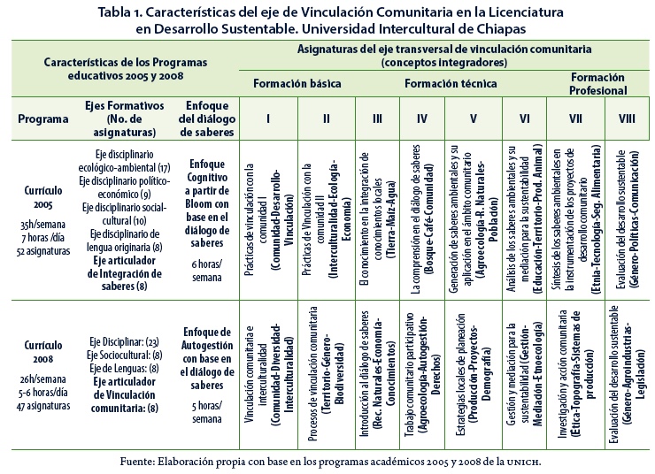 El modelo educativo intercultural en desarrollo sustentable cuenta con el eje transversal de vinculación comunitaria como articulador de los otros ejes académicos formativos (Tabla 1). Así, el eje de vinculación integra a las asignaturas de cada semestre de manera vertical y horizontal, a través de un proceso educativo de complejidad creciente, que contribuye a la formación integral del estudiante mediante la interacción de los saberes disciplinarios y comunitarios.
