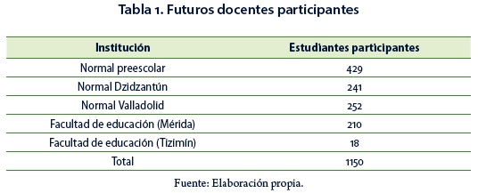 Se tomó como población a todos los alumnos de las Escuelas Normales del estado de Yucatán, así como a los de la Facultad de Educación de la Universidad Autónoma de Yucatán (UADY), inscritos al ciclo escolar 2015-2016. La muestra se determinó a través de un muestreo por conglomerados, quedando constituida por 1,150 estudiantes, distribuidos como se ve en la Tabla 1.