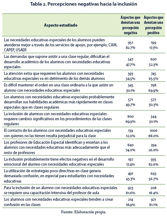 A partir de la Tabla 2, se observa que los únicos aspectos sobre el proceso de inclusión en los que las respuestas de los futuros maestros no indican una percepción negativa son los relativos a la presencia de alumnos con necesidades educativas en la clase, el no considerar que su presencia pueda ser perjudicial o que su presencia en el salón de clases cause confusión a los propios alumnos con necesidades educativas, así como que ésta les provoque una afectación emocional. Este hecho sugiere que la conceptualización sobre el proceso de educación inclusiva de los futuros docentes se limita únicamente al "deber ser"; es decir, su percepción es positiva mientras no les demande alguna obligación más que la de dar acceso físico al aula.