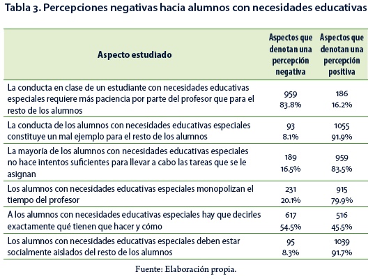 De igual forma, en la Tabla 3 se presenta el análisis realizado a la dimensión "Percepciones negativas hacia los alumnos con necesidades educativas".