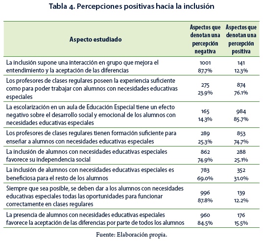 En cuanto a las "Percepciones positivas hacia la inclusión" de los futuros docentes, los resultados se muestran en la Tabla 4.