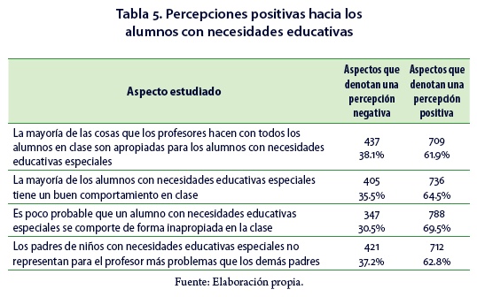 Finalmente, en lo que respecta a las "Percepciones positivas hacia los alumnos con necesidades educativas", en la Tabla 5 se presentan los resultados del análisis de frecuencias y porcentajes realizado para dicha dimensión.