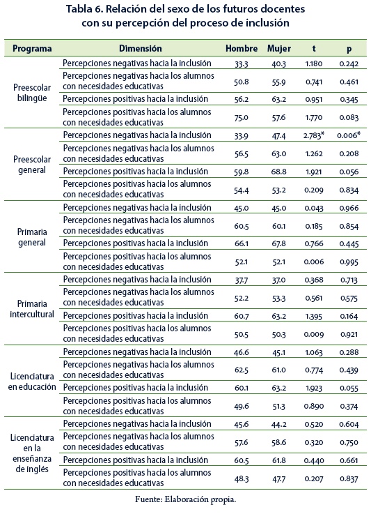 Por otra parte, para identificar los factores que influyen en la percepción sobre el proceso de educación inclusiva de los futuros docentes se analizaron las variables: sexo, programa de estudio, semestre y prácticas realizadas. Los resultados relativos a la variable sexo se presentan en la Tabla 6.