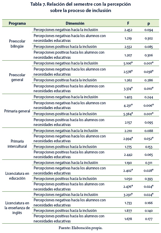 En la Tabla 7 se evidencia que existe diferencia en la percepción sobre el proceso de educación inclusiva en la mayoría de los programas formativos estudiados, dependiendo del semestre en el que se encuentran los estudiantes; sin embargo, dichas diferencias se presentan en diversos aspectos de la percepción (dimensiones). Lo anterior pudiera obedecer a los contenidos curriculares sobre el tema que reciben los estudiantes en cada semestre.