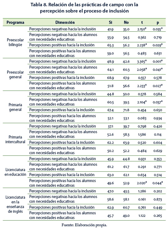 En lo que respecta al estudio de la relación entre haber hecho o no prácticas de campo con la percepción sobre el proceso de educación inclusiva, en la Tabla 8 se presentan los resultados.