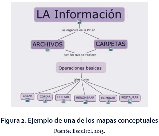 Los mapas conceptuales elaborados con el empleo de la herramienta Cmap Tools (Figura 2) se conciben como recursos, métodos y estrategias en el aprendizaje del escolar. Aprovechando las potencialidades de la propia herramienta, a cada mapa le han sido incorporados recursos en diferentes formatos que facilitan la estructuración del mapa mental del escolar, a partir de un sistema de conceptos asociados a un contenido informático específico.