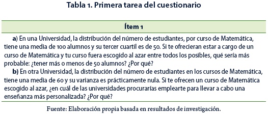 El ítem 1 (Tabla 1) refiere a medidas de posición y dispersión. Estas tareas pertenecen a los géneros de tarea G7 y G6. La inclusión de este ítem tuvo en cuenta que las medidas de tendencia central son la base para la comprensión de muchas otras nociones estadísticas.
