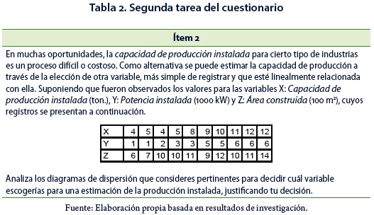 La tarea del ítem 2 (Tabla 2) refiere al estudio de correlación y regresión lineal. El estudio de estas nociones involucra procesos iniciales de inferencia estadística, permitiendo hacer estimaciones en contextos donde el azar se encuentra presente. La tarea refiere a una posible relación lineal entre pares de variables numéricas continuas. Esta tarea pertenece a los géneros de tarea G4, G2, G3 y G6. El entorno tecnológico que justifica el hacer de la tarea involucra las nociones de diagrama de dispersión, coeficiente de correlación lineal y recta de regresión lineal.