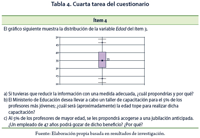En el ítem 4 (Tabla 4) se presenta el gráfico de caja para los datos de la variable numérica continua Edad, presentados en la tabla del ítem 3 (Tabla 3). En este ítem se intenta revertir la típica tarea de cálculo de los cinco números resumen y la posterior construcción de un gráfico de caja. Aquí no se requiere ni el cálculo de medidas descriptivas, ni la construcción de gráficos. De este modo, el hacer del ítem se vincula con el indicador de completitud OML4.