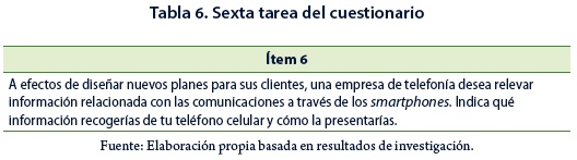 Las tareas del ítem 6 (Tabla 6) indagan el cumplimiento del indicador de completitud existencia de tareas matemáticas "abiertas" (OML6). Estas tareas intentan revertir las situaciones típicas de suministrar datos de alguna variable estadística, prescindiendo del modo de relevamiento de la información. Este ítem se vincula con los géneros de tarea G1, G4 y G5, y demandan reconocer, entre la información disponible en el celular, aquella que puede considerarse una variable estadística. El modo en que se presenten los datos incluye la construcción de una tabla de frecuencias. Una técnica gráfica de presentación de la información demanda construir un gráfico que muestre las características de la información registrada, la que también se puede presentar mostrando las medidas resumen adecuadas. El entorno tecnológico de este ítem, contempla las nociones de variable estadística y su clasificación, de frecuencia absoluta y relativa, de gráficos estadísticos y de medidas resumen. De esta forma, la tarea permite indagar el cumplimiento del indicador de completitud OML5.