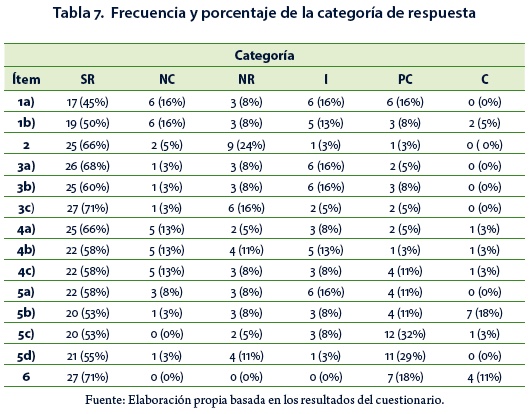 Para todos los incisos del ítem 5 (Tabla 5), el porcentaje de respuestas de la categoría SR es similar: 58% en el inciso 5a), 53% en 5b) y 5c), 55% en 5d) (Tabla 7).