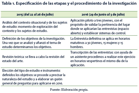 El evento Campus Party fue el espacio para dialogar individualmente con estudiantes de las ingenierías una vez precisados los fines de su participación. Para la entrada a campo se establecieron algunas situaciones de control: a) la realización de las entrevistas se daría en el mismo horario; b) se entrevistaría a un hombre y a una mujer de manera intercalada; c) se escogería a simple vista a los de menor edad, partiendo del supuesto que estos recién ingresan a estudiar; d) la elección de los jóvenes sería al azar. La definición y el procedimiento del estudio se dieron en dos momentos, en 2015 y en 2016, como se muestra en la Tabla 1.