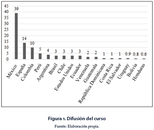 Sobre la difusión de los REA, se encontró que el curso tuvo un alcance casi global en el continente americano, principalmente en países como México (39%) y Colombia (10%). A nivel europeo, España (14%) fue el país donde el curso alcanzó una mayor difusión. Esta conclusión se da con base en los 14,227 participantes registrados en el curso, los cuales tienen origen en 101 países distintos. Sin embargo, es importante destacar que la cantidad de participantes registrados no asegura completamente la difusión. Al respecto, la participación activa es un indicador importante para asegurarla, ya que hace referencia a los participantes que sí están expuestos a los contenidos del curso. En este sentido, la difusión del curso está relacionada con la misma enseñanza, de la cual los participantes se benefician al realizar algún tipo de actividad. Dado que el objetivo del curso es fomentar y desarrollar habilidades en el uso de REA, el análisis de la difusión y la enseñanza no se puede disociar. Desde este punto de vista, se considera significativa la difusión que tuvo el curso, ya que fueron 6,716 participantes los que estuvieron activos realizando actividades en relación con los REA, alcances que no se pueden lograr mediante otros tipos de formación, tales como la presencial o incluso la formación en línea en su formato tradicional.