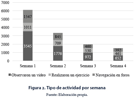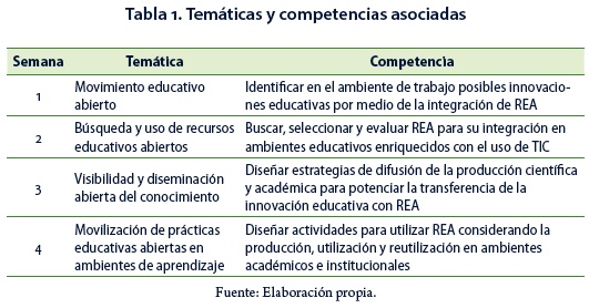 Organización del curso: tiene una duración de 4 semanas en las que se solicita al participante una actividad de entre 46 horas semanales donde se desarrollan ciertas temáticas y competencias (Tabla 1). En la dinámica semanal de actividades se establecen cuatro actividades principales, que consisten en 1) participar en encuestas de opinión, 2) analizar videos, lecturas y materiales, 3) evidenciar el aprendizaje en portafolios y socializarlo en los espacios del curso y 4) autoevaluar el aprendizaje.
