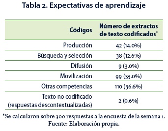 Al inicio del curso, se preguntó a los participantes sobre los aprendizajes que esperaban obtener de su intervención en éste. Del corpus codificado, resultó que el código otras competencias fue el de mayor predominancia en las respuestas de los participantes (Tabla 2). Esto implica que los participantes percibieron en el curso una oportunidad para desplegar ciertas competencias asociadas al uso de la tecnología, tales como la comunicación en línea, el manejo de redes sociales, estrategias didácticas para cursos en línea, uso de las plataformas virtuales de aprendizaje y el desarrollo de investigación en el tema de innovación educativa. Sobre las competencias asociadas a la utilización de REA, la movilización (33%) fue la competencia que los participantes señalaron como su principal expectativa de aprendizaje, seguido de la producción (14%). De tal manera, los participantes esperan, al finalizar el curso, poder producir y hacer uso de REA en su práctica profesional.