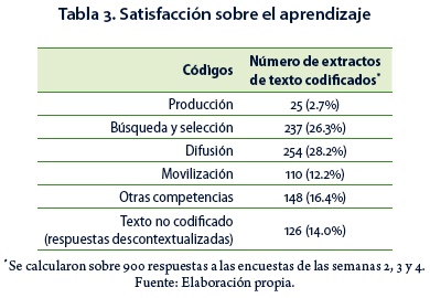 De la segunda semana en adelante, se preguntó a los participantes acerca de los aprendizajes más importantes que obtuvieron en cada una de las semanas (Tabla 3). Con relación a ello, se encontró una correspondencia entre las expectativas y la satisfacción del aprendizaje. Sin embargo, esta correspondencia tuvo lugar principalmente en las competencias búsqueda y selección y en la difusión de REA, que aunque se mencionaron en menor proporción como expectativas de aprendizaje, de acuerdo con los participantes fueron las que ampliaron en mayor medida. De la misma forma, se halló una vinculación con el desarrollo de competencias en el uso de la tecnología.