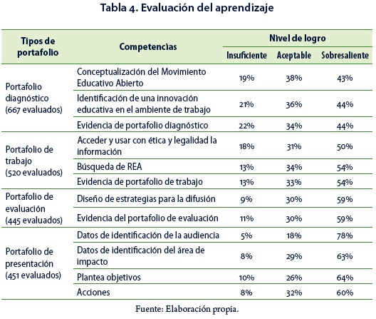 Como estaba planeado en la propuesta de aprendizaje del curso, se realizó la evaluación de portafolios al final de cada semana. De esta evaluación se obtuvieron los niveles alcanzados en cada competencia planteada como objetivo del curso (Tabla 4). Los participantes alcanzaron en su mayoría niveles sobresalientes en cada una de las competencias o conocimientos. Destacan respecto al diseño de estrategias de difusión de la producción científica y académica para potenciar la transferencia de la innovación educativa con REA (59% en nivel sobresaliente), competencia que se vincula con la selección de espacios virtuales (redes sociales/plataformas/repositorios), considerando la población a la que se dirige el recurso y los objetivos del mismo.