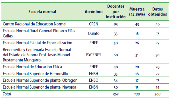 La población objetivo fueron los docentes de las escuelas normales del estado de Sonora. El sistema de escuelas normales está integrado por ocho instituciones en las cuales se ofrecen 13 licenciaturas (Yáñez et al., 2014). La planta docente de las ocho instituciones normalistas está compuesta por 367 profesores (DGESPE, 2015). La muestra se constituyó por 188 docentes (calculada con un parámetro de confianza de 95% de acierto y 5% de error) lo cual representa 52.86% de la población total de docentes de las ocho instituciones normalistas.