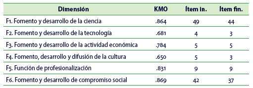 Posteriormente, se llevó a cabo un análisis factorial exploratorio con método de máxima verosimilitud y rotación Oblimin, con el objetivo de identificar la estructura subyacente del modelo de medida (Tabla 3). Se suprimieron los reactivos con un peso factorial inferior a .35. A través de su peso factorial, congruencia conceptual y punto de quiebre, la función de fomento y desarrollo de la ciencia (F1) y la función de compromiso social (F6), mostraron constituirse por tres factores cada una. El resto de las funciones (F2, F3, F4 y F5) mostraron componerse por un solo factor.