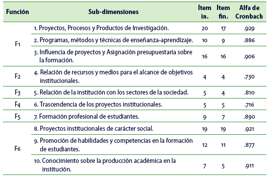 Para el análisis de las dimensiones resultantes de la validación del instrumento, se organizaron y clasificaron en tres categorías vinculadas con las funciones sustantivas de la educación superior. En la primera categoría se organizan las subdimensiones relacionadas con la producción de conocimiento e investigación científica. La segunda categoría se relaciona con las condiciones que guarda la escuela normal para una docencia de calidad y una formación educativa pertinente. La tercera categoría se asocia con las condiciones institucionales para la vinculación con los sectores de la sociedad.