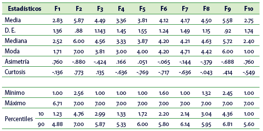 Se llevó a cabo un análisis descriptivo de las respuestas (perspectiva) de los docentes sobre la funcionalidad institucional, con el fin de constatar las características de distribución de las respuestas para cada una de las funciones (subescala). Se revisaron los estadígrafos media, mediana y moda, el coeficiente de Curtosis, la asimetría y la prueba Kolmogorov-Smirnov (Barton & Peat, 2014). Lo cual determinó una distribución de las respuestas normalizada. Para las 10 funciones la asimetría y el coeficiente de Curtosis muestran una tendencia a uno (Tabla 5).