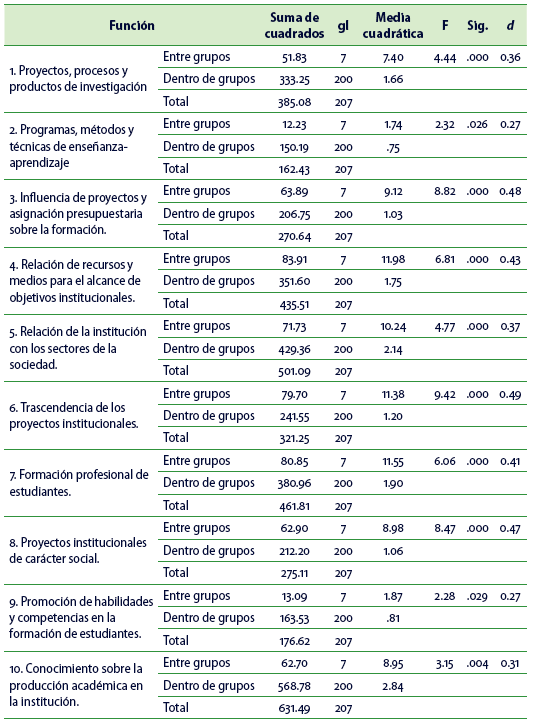 En contraste, la función promoción de habilidades y competencias en la formación de estudiantes (F9) presenta el valor más bajo del estadístico F (2.28) y un tamaño de efecto mediano (d = 0.27). En todos los casos, el valor de F mantiene un nivel de significancia menor a .05, lo que significa que se rechaza la hipótesis de igualdad de medias.