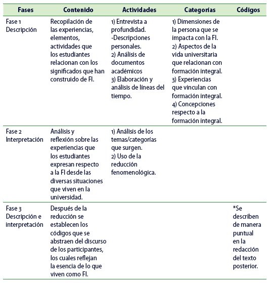 Las fases del método fenomenológico describen los contenidos y actividades que tienen su desenlace en los discursos de los estudiantes, los cuales reflejan la esencia del significado que han construido alrededor de la FI que se promueve en su universidad (Tabla 2).