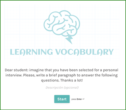De acuerdo con Marin-Marin (2005), las preguntas 2-4 representan la ruta regular que suelen tomar los estudiantes para aprender vocabulario; es decir, desde el momento que encuentran una palabra desconocida y deciden hacer algo al respecto, hasta su consolidación para que forme parte de su léxico mental. En la Figura 1 se muestra la página de presentación de la encuesta semiestructurada.